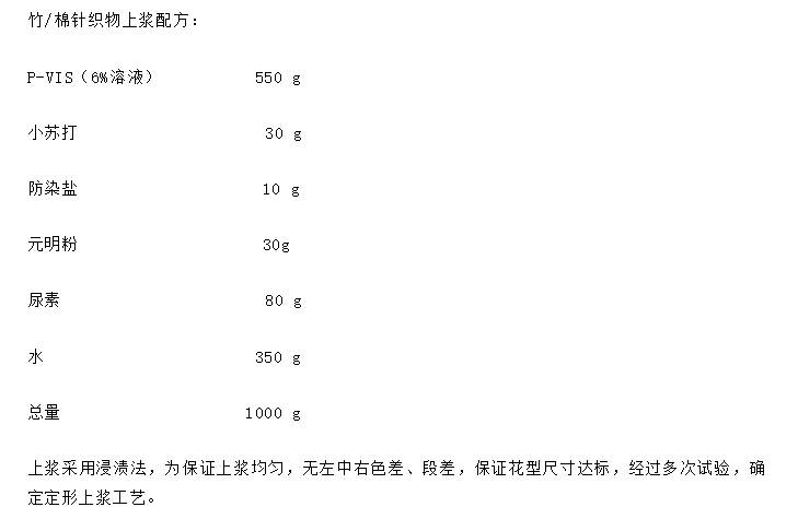 由于數(shù)碼噴印的墨水是水溶性的,噴印之前布要經(jīng)過上漿,把活性染料固色所需的助劑在上漿的過程中一起施加在布上,采用天然改性和合成聚合物的混合物P-VIS糊料上漿,脫糊性好,和活性染料及助劑的相容性好,賦予數(shù)碼印花織物良好的得色率和輪廓清晰度。