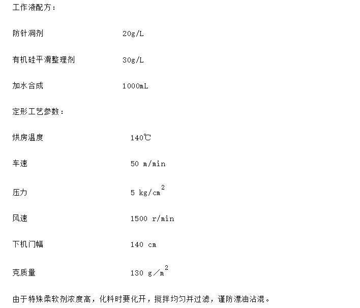 篩選復(fù)配端氨基改性與脂肪胺復(fù)配型有機(jī)硅整理劑,使織物獲得優(yōu)良的柔軟手感,具有平滑,極佳的彈性,無漂油現(xiàn)象,作用機(jī)理:與纖維表面的羥基羧基等相互作用,與纖維形成取向吸附,使纖維之間的摩擦系數(shù)下降;采用濕定拉幅工藝,先軋工作液。