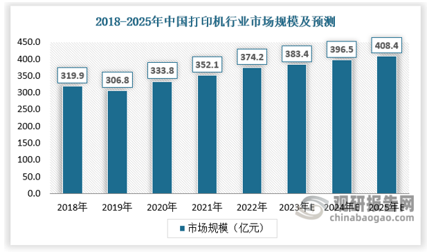 隨著下游需求快速增長(zhǎng),近年來我國(guó)打印機(jī)市場(chǎng)規(guī)模呈現(xiàn)穩(wěn)定增長(zhǎng)態(tài)勢(shì)。2022年我國(guó)打印機(jī)市場(chǎng)規(guī)模374.2億元,預(yù)計(jì)2025年我國(guó)打印機(jī)市場(chǎng)規(guī)模將達(dá)到408.4億元左右。