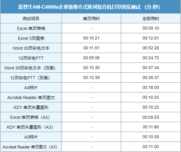 由于采用了由Heat-Free冷印技術(shù)噴頭組成的陣列式打印頭,愛普生AM-C4000a企業(yè)級墨倉式陣列復(fù)合機在輸出速度上讓我們期待,我們對該產(chǎn)品進行了標準的數(shù)碼復(fù)合機速度測試,這也是我們首次將采用激光打印技術(shù)的復(fù)合機類產(chǎn)品的輸出速度測試標準直接應(yīng)用于噴墨打印技術(shù)的產(chǎn)品上,具體表現(xiàn)詳見下表: