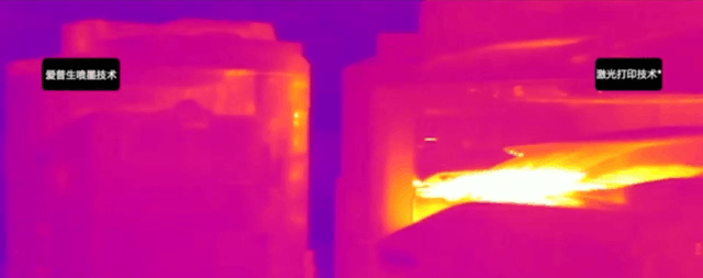 其次,通過熱成像對比,我們可以看到噴墨和激光打印過程中產(chǎn)生的熱量不同,機身內(nèi)的溫度降低不僅意味著諸如搓紙輪和齒輪等橡膠、塑料部件的老化速度降低,更意味著諸如機身內(nèi)的主板可以獲得更好的散熱效率。
