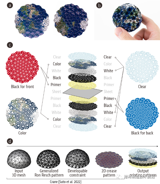 隨著3D打印技術(shù)的發(fā)展,具有可控性能的智能結(jié)構(gòu)4D打印正在獲得大量研究,折紙鑲嵌,有望為產(chǎn)品開辟新的設(shè)計(jì)和應(yīng)用。當(dāng)前最流行的4D打印方法之一是通過加熱故意使從FDM 3D打印機(jī)擠出的熱塑性塑料發(fā)生變化,以實(shí)現(xiàn)運(yùn)動(dòng)或存儲(chǔ)。這種方法的優(yōu)點(diǎn)在于工藝容易獲得且成本較低,但分辨率不可避免的受到FDM 3D打印機(jī)的限制。另一種流行的4D打印方法是打印對(duì)濕度變化或(脫)水化反應(yīng)的可收縮自折疊材料,這種方法對(duì)需要生物安全性能的可穿戴設(shè)備和食品特別有用。然而,對(duì)于復(fù)雜的形狀變化,分辨率仍然是無法回避的問題??傊?dāng)前的4D打印技術(shù),要么分辨率低,要么需要手工,容易出錯(cuò)且后處理較為耗時(shí)。