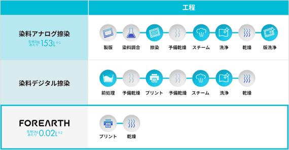 要減少水的使用,可以從普通的“染料印刷”轉向“涂料印刷”,在一定程度上是可以的。然而,由于顏料墨水印刷質地粗糙、顯色性低、牢度低,一直是時尚界的一個主要問題(*1)。“FOOREARTH”克服了涂料印花的這些缺點,可以打印出可用于女裝的質量。
