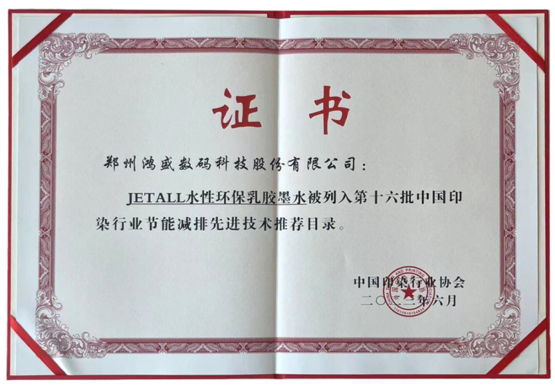 鴻盛數(shù)碼以JETALL®水性環(huán)保乳膠墨水印刷方案為申報(bào)主題,現(xiàn)場(chǎng)展示了產(chǎn)品打印的成品、通過視頻演示了打印過程,以圖片形式說明了項(xiàng)目技術(shù)原理。JETALL®水性環(huán)保乳膠墨水印刷方案解決了在非吸收性介質(zhì)不吸收、不能成像的技術(shù)難點(diǎn),打印的產(chǎn)品具有無氣味、無腐蝕、無揮發(fā)、色彩飽和度高、牢度好等優(yōu)點(diǎn),可廣泛應(yīng)用于數(shù)碼印花、數(shù)碼印刷、數(shù)碼影像、藝術(shù)品復(fù)制、家居裝璜等各種領(lǐng)域。JETALL®水性環(huán)保乳膠墨水通過國際權(quán)威SGS公司檢測(cè)和國家棉花及紡織服裝產(chǎn)品質(zhì)量監(jiān)督檢驗(yàn)中心檢測(cè),2023年6月成功入選《第十六批中國印染行業(yè)節(jié)能減排先進(jìn)技術(shù)推薦目錄》。