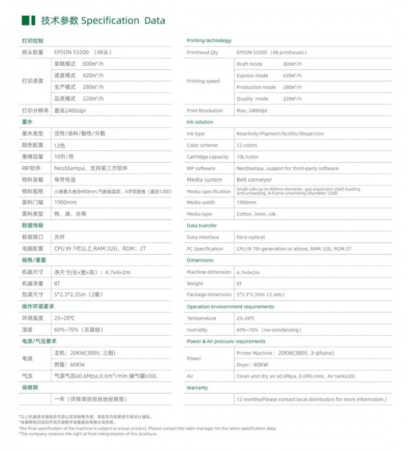 作為潤天智在數(shù)碼印花領(lǐng)域深耕不輟的最新力作。彩神X5高速數(shù)碼印花機延續(xù)了彩神高效、穩(wěn)定的風(fēng)格,支持12色高速高精度打印,可搭載最高48個愛普生S3200工業(yè)級按需壓電打印頭,打印最高可達(dá)1000㎡/h,是紡織工業(yè)印刷行業(yè)實現(xiàn)提質(zhì)增效的最新優(yōu)選。