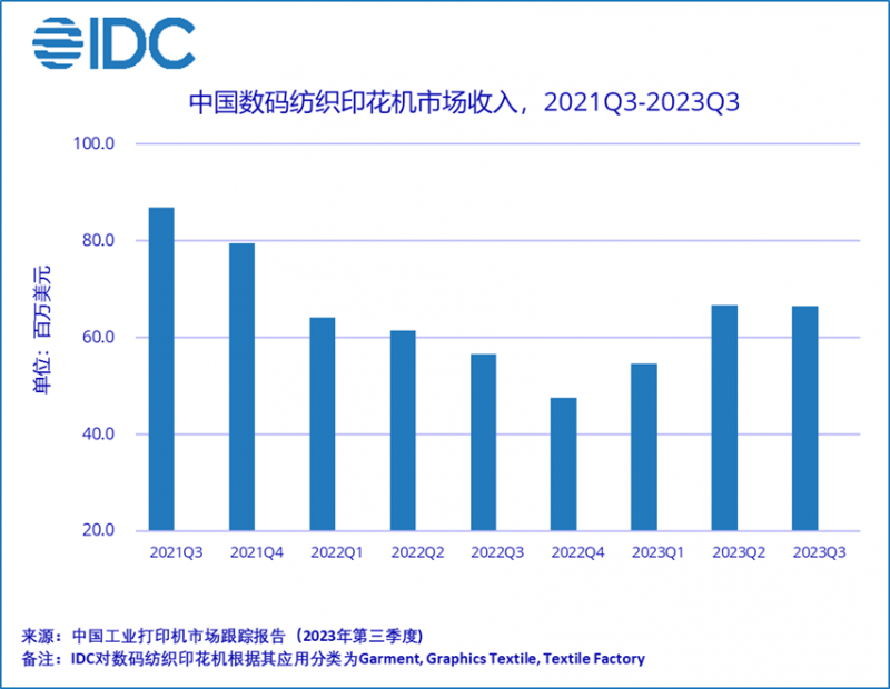IDC發(fā)布的《中國工業(yè)打印機市場跟蹤報告(2023年第三季度)》顯示,2023年第三季度,中國數(shù)碼紡織印花機市場收入超過6,600萬美元,同比上升17.2%。其中白墨燙畫抖粉機市場收入高達400萬美元,同比上升64.2%;轉(zhuǎn)印打紙類機器市場收入超過4800萬美元,同比上升7.8%;直噴打布類機器市場收入超過1,400萬美元,同比上升50.1%。