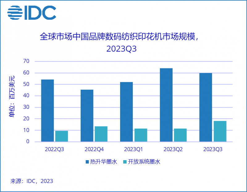 IDC《全球工業(yè)打印機(jī)市場(chǎng)季度跟蹤報(bào)告》顯示,2023 年第三季度,全球數(shù)碼紡織印花機(jī)的市場(chǎng)收入為1.31 億美元,同比上升13.7%。其中,中國(guó)品牌市場(chǎng)收入為7,800萬美元,占整體市場(chǎng)的59.5%,同比增長(zhǎng) 22.4%。