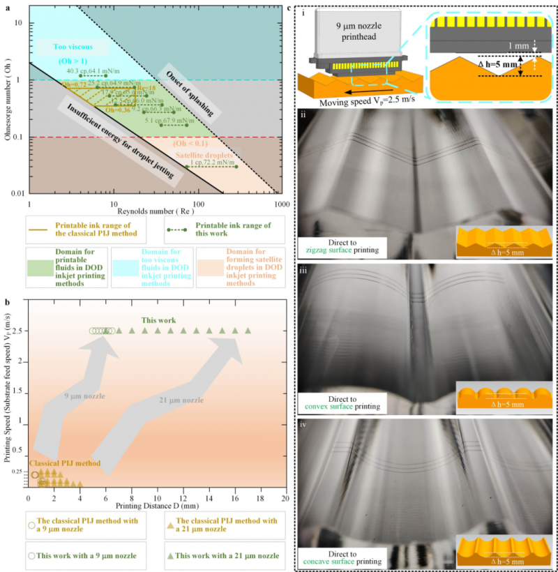 通過圖案打印測試對所提出的超高墨滴速度壓電式打印策略的打印能力進行了評估(圖2):(a)打印速度和打印距離幾乎同時提高了10倍(圖2a);(b)非常有趣的是可打印墨水材料的兼容性也得到了擴展(圖2b),對于所使用的壓電打印頭,可打印墨水的Oh數(shù)和粘度分別從0.36–0.72擴展到0.03–1.18和10–12cp擴展到1–40.3cp,這甚至打破了經(jīng)典壓電噴墨打印技術(shù)可打印墨水Oh數(shù)為0.1-1和粘度為1-25cp的傳統(tǒng)限制;(c)具備曲面的變間距共形打印的能力(圖2c)。