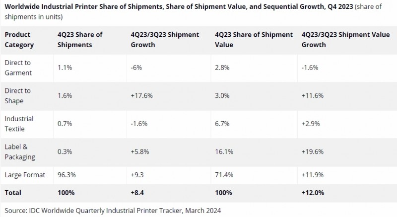 與強(qiáng)勁的 2023 年第三季度相比,工業(yè)紡織品細(xì)分市場出貨量下降了 1.6%,而直接印于織物設(shè)備 (Direct-to-garment) 細(xì)分市場的出貨量下降了 6%,原因是越來越多的用戶投資于直接印于薄膜 (Direct-to-film) 的印刷系統(tǒng)。