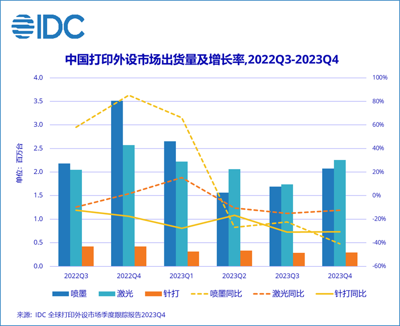 IDC最新發(fā)布的《全球打印外設市場季度跟蹤報告(2023年第四季度)》顯示,2023年第四季度,中國打印外設市場出貨量為462.5萬臺,同比下降29.0%,環(huán)比增加24.2%。其中噴墨打印機出貨量207.7萬臺,同比下降40.9%;激光打印機出貨量225.5萬臺,同比下降12.4%;針式打印機出貨量29.3萬臺,同比下降30.7%。經(jīng)濟下行,四季度雖然為傳統(tǒng)采購旺季,但整體需求未達預期。
