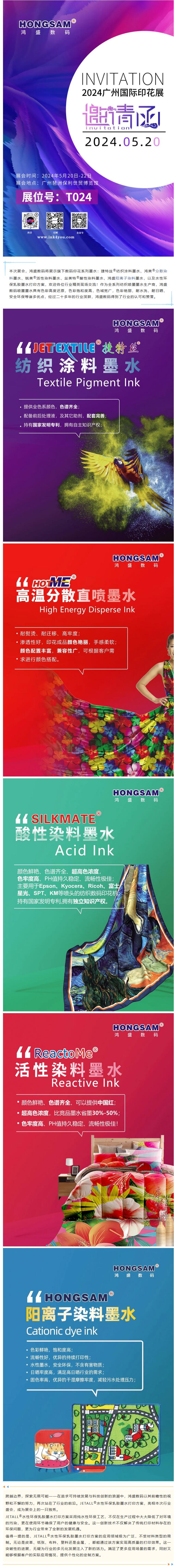 在浪漫滿(mǎn)溢的5月20日,備受矚目的2024廣州國(guó)際紡織制衣及印花工業(yè)博覽會(huì)(簡(jiǎn)稱(chēng)“廣州國(guó)際印花展”)將于2024年5月20日-22日在廣州琶洲保利世貿(mào)博覽館盛大開(kāi)幕。此次展會(huì)不僅是一場(chǎng)紡織印花行業(yè)的盛會(huì),更是一次創(chuàng)新、技術(shù)與藝術(shù)的完美碰撞。屆時(shí),鴻盛數(shù)碼(展位號(hào):T024)將攜旗下紡織系列墨水及打印方案隆重亮相,敬請(qǐng)期待!