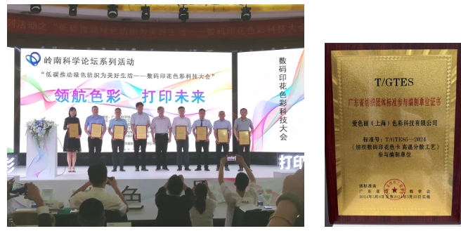 5月23日,由廣東省科協(xié)指導(dǎo),廣東省紡織工程學(xué)會(huì)主辦的2024年《嶺南科學(xué)論壇》系列活動(dòng):低碳推動(dòng)綠色紡織為美好生活——數(shù)碼色彩印花科技大會(huì)在廣州市番禺區(qū)舉行。會(huì)上,廣東省團(tuán)體標(biāo)準(zhǔn)《數(shù)碼印花色卡、高溫分散工藝》正式發(fā)布,同時(shí)頒發(fā)了廣東省數(shù)碼印花色彩研究中心。