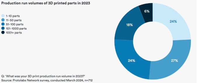 2023年 3D 打印部件的生產(chǎn)運(yùn)行量。圖片來自 Protolabs。