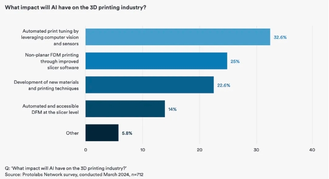 其次,25% 的受訪者認(rèn)為,人工智能將通過改進(jìn)的切片軟件提高非平面 FDM 3D 打印的可訪問性。增材制造設(shè)計(jì) (DfAM) 也被認(rèn)為受益于人工智能創(chuàng)新。這將包括改進(jìn)的拓?fù)鋬?yōu)化、多物理場(chǎng)過程模擬和人工智能生成的 CAD。