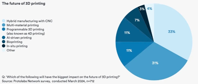 根據(jù)Protolabs的2024年報(bào)告,新型材料的擴(kuò)擴(kuò)充將在未來3D打印應(yīng)用的發(fā)展中發(fā)揮關(guān)鍵作用。31%的受訪者表示,多材料3D打印將對(duì)增材制造領(lǐng)域產(chǎn)生最大影響。