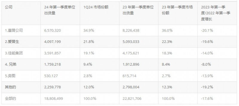 惠普和愛普生合計(jì)占據(jù)約一半的市場(chǎng)份額,受影響最大,分別下降了 20.1% 和 19.6%。相比之下,兄弟的降幅僅為 8%。值得注意的是,兄弟通過亞太地區(qū)以 B2B 為重點(diǎn)的渠道成功增加了墨盒出貨量,從而實(shí)現(xiàn)了同比增長(zhǎng)。