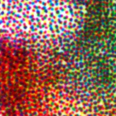 若使用高倍放大鏡觀察噴墨輸出的影像,就可以看到各色的墨水在紙材上形成一個個的墨點(見下圖)。