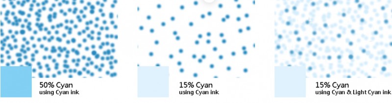 所以第二步進階提升噴墨影像品質(zhì)的方法便是加入較淡的同色系墨水,這使得需要低濃度輸出的情況可以使用較多墨點的淡墨來取代濃墨,如此一來便可避免原本低濃度少墨點造成解析度和細膩度下降的缺失。