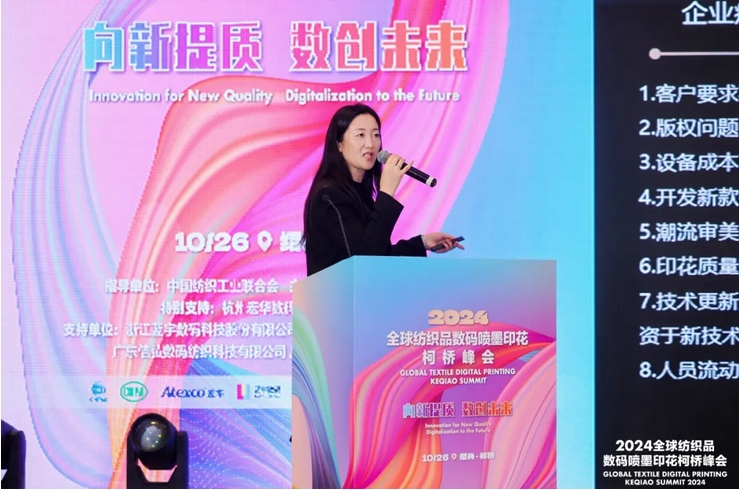 為進(jìn)一步推動數(shù)碼噴墨印花行業(yè)提質(zhì)增效、向新發(fā)展,加快形成具有高效能、高技術(shù)和高質(zhì)量特征的新質(zhì)生產(chǎn)力,10月26日,以“向新提質(zhì) 數(shù)創(chuàng)未來”為主題的2024全球紡織品數(shù)碼噴墨印花柯橋峰會在柯橋舉行。與會代表圍繞國內(nèi)外紡織品數(shù)碼噴墨印花市場現(xiàn)狀、前沿技術(shù)、營銷模式、產(chǎn)品開發(fā)及人工智能在數(shù)碼印花領(lǐng)域應(yīng)用等方面進(jìn)行了深入研討和對接交流。