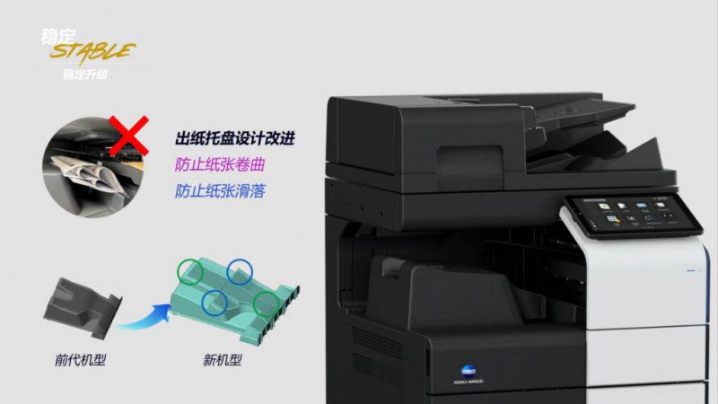 相較于前代產(chǎn)品,柯尼卡美能達全新 i 系列在穩(wěn)定性上也進行了優(yōu)化升級,尤為突出的是出紙托盤的創(chuàng)新調(diào)整,新設計能夠有效防止紙張卷曲及滑落現(xiàn)象,使得穩(wěn)定性顯著提升。