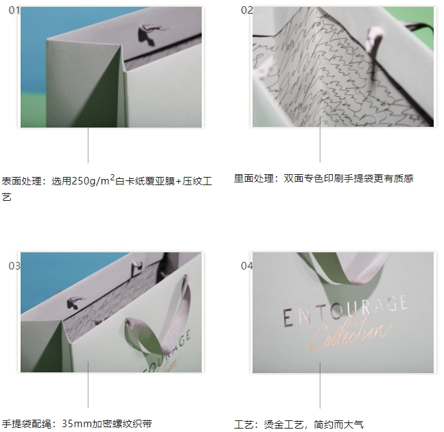 設(shè)計環(huán)節(jié)的精細(xì)處理:手提袋設(shè)計要精準(zhǔn)展現(xiàn)商品特性,清晰傳達(dá)品牌信息,發(fā)揮品牌宣傳作用。在追求功能合理性的同時,還要傳遞商品信息,展現(xiàn)企業(yè)形象或獨特的文化氣息。因此,創(chuàng)意在手提袋印刷設(shè)計中至關(guān)重要。設(shè)計者需要結(jié)合企業(yè)的文化背景、產(chǎn)品功能等因素,確定手提袋的材質(zhì)、尺寸、印刷工藝、稱重能力等,確保設(shè)計既美觀又實用。例如,表面處理可選用250g/m²白卡紙覆亞膜+壓紋工藝;里面處理采用雙面專色印刷,提升手提袋質(zhì)感;手提袋配繩選擇35mm加密螺紋織帶;運用燙金工藝,讓手提袋更顯簡約大氣。