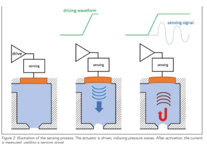 創(chuàng)新的傳感過程使用噴嘴的壓電致動器作為傳感器。致動器的驅動在流體中產生壓力波。這些波在噴嘴腔內來回反彈,向致動器施加壓力。這就產生了與壓力變化成正比的微小但可測量的電流(見圖 2)。