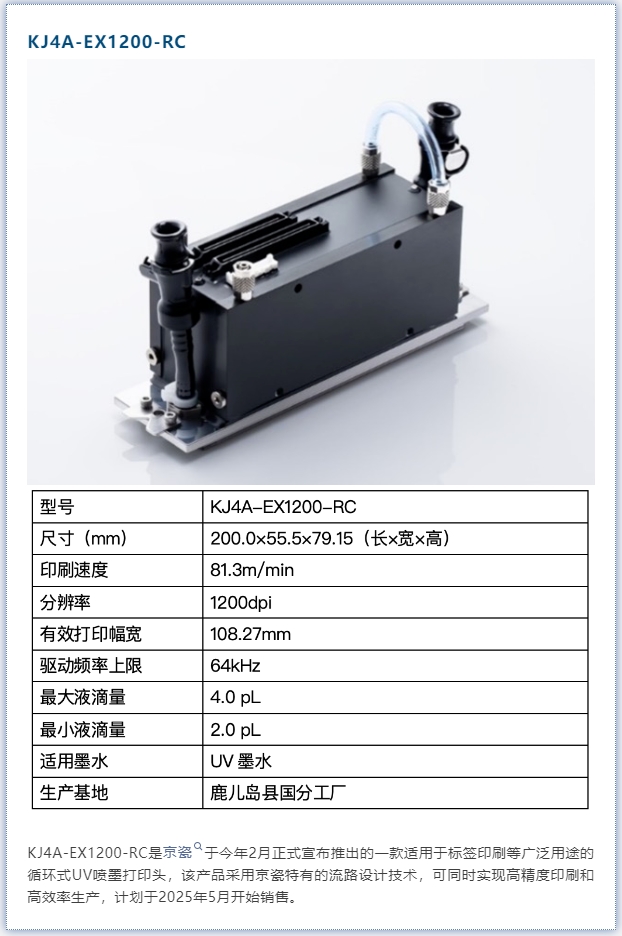 KJ4A-EX1200-RC是京瓷于今年2月正式宣布推出的一款適用于標(biāo)簽印刷等廣泛用途的循環(huán)式UV噴墨打印頭,該產(chǎn)品采用京瓷特有的流路設(shè)計(jì)技術(shù),可同時(shí)實(shí)現(xiàn)高精度印刷和高效率生產(chǎn),計(jì)劃于2025年5月開始銷售。