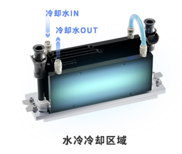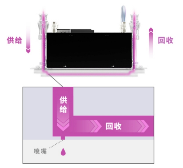 京瓷特有的直達(dá)噴嘴孔的循環(huán)結(jié)構(gòu),可實(shí)現(xiàn)均勻的溫度管理,有效抑制墨水沉淀,從而穩(wěn)定印刷。并且,該結(jié)構(gòu)可有效減少打印頭洗凈等重啟作業(yè)中的維護(hù)成本。此外,本產(chǎn)品水冷※2規(guī)格為標(biāo)準(zhǔn)規(guī)格,通過水冷結(jié)構(gòu)實(shí)現(xiàn)打印頭的溫度均衡,確保了連續(xù)印刷和印刷質(zhì)量的穩(wěn)定性?!?:通過冷卻水冷卻打印頭內(nèi)部驅(qū)動(dòng)板卡的冷卻功能