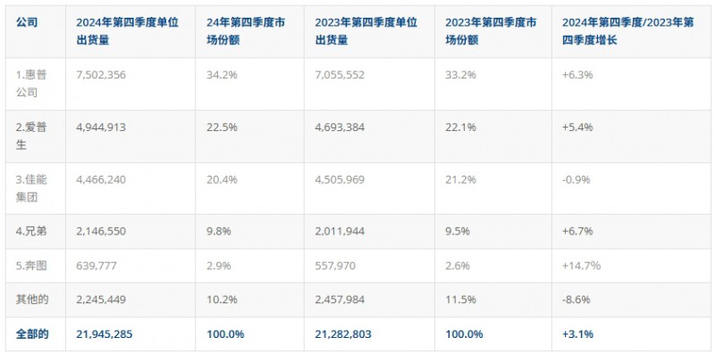 分廠商來看,除佳能小幅下滑0.9%外,各大打印機OEM廠商均實現(xiàn)增長?;萜?、愛普生、佳能占據(jù)市場份額前三,分別為34.2%、22.5%、20.4%,奔圖則連續(xù)數(shù)個季度保持增長最快,第四季度增長14.7%。
