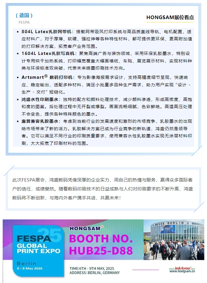 5月6日,為期四天的2025德國(guó)柏林FESPA全球印刷博覽會(huì)順利開(kāi)幕,作為數(shù)碼印刷行業(yè)的全球盛會(huì),當(dāng)然不能缺少鴻盛數(shù)碼的身影。本屆展會(huì),鴻盛數(shù)碼攜帶其全系列噴墨墨水(數(shù)碼印花類(lèi) 數(shù)碼影像類(lèi) 數(shù)碼印刷類(lèi))及三種不同的數(shù)碼印刷解決方案亮相,捷傲®水性乳膠打印依舊是展會(huì)中的重頭戲,成為展會(huì)中的一大亮點(diǎn)。