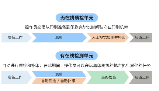 在線質(zhì)量檢測(cè)單元可在印刷過程中以高精度完成全自動(dòng)檢測(cè),顯著減少質(zhì)檢環(huán)節(jié)的時(shí)間與人力投入,大幅降低印品質(zhì)檢環(huán)節(jié)的負(fù)擔(dān)并提升印品質(zhì)量的穩(wěn)定性。