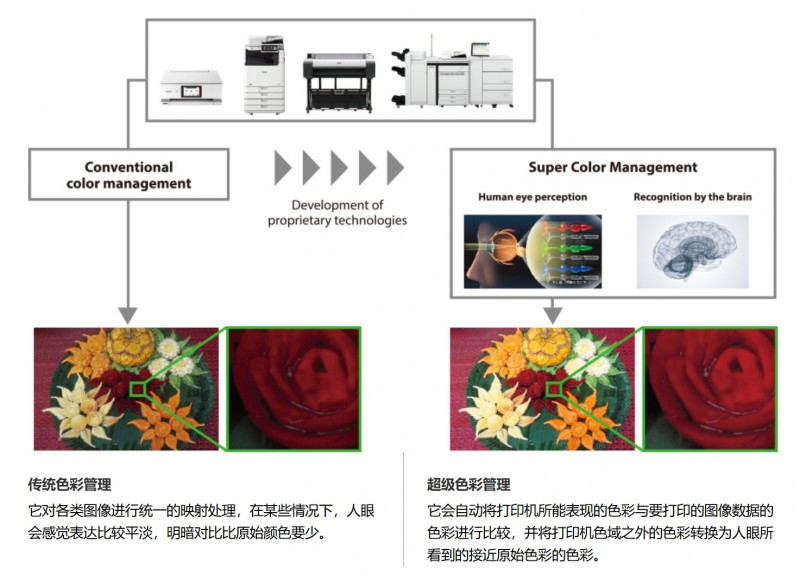 佳能致力于通過開發(fā)超級色彩管理 (SCM) 技術(shù),重現(xiàn)人眼感知的色彩。即使待打印圖像和打印打印機的色域存在巨大差異,SCM 技術(shù)也能正確處理色彩。