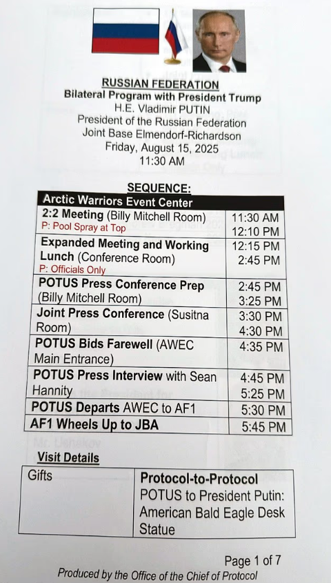 文件的第六、七頁(yè)則詳細(xì)記載了因故未能舉行的午宴方案。原計(jì)劃以 “尊貴的弗拉基米爾?普京閣下” 名義舉辦的午宴,菜單包括綠蔬沙拉、奧林匹亞比目魚(yú)配腓力牛排及焦糖布丁甜點(diǎn)。午宴的座位圖也一并曝光,特朗普與普京相對(duì)而坐,美總統(tǒng)右側(cè)依次為國(guó)務(wù)卿魯比奧、國(guó)防部長(zhǎng)赫格塞思及白宮幕僚長(zhǎng)蘇珊?懷爾斯,左側(cè)為財(cái)長(zhǎng)貝森特、商務(wù)部長(zhǎng)盧特尼克及中東問(wèn)題特使威特科夫;普京總統(tǒng)兩側(cè)分別為外長(zhǎng)拉夫羅夫及總統(tǒng)助理烏沙科夫。