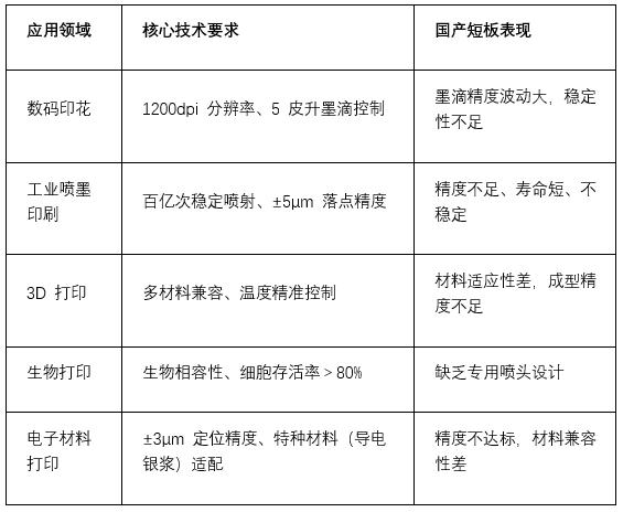 • 應(yīng)用場景開發(fā)滯后:針對電子印刷(PCB / 光伏)的 ±3μm 精度需求、生物打印的細胞兼容性需求,國內(nèi)企業(yè)尚未形成針對性解決方案,高端應(yīng)用場景仍依賴進口噴頭與集成系統(tǒng)。