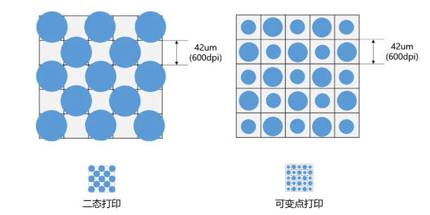 數(shù)碼打印按墨滴量也分為兩類:雙態(tài)打印和可變點打印。京瓷噴頭屬于后者,在較高的點火頻率(30~40kHz)下,可實現(xiàn)4~5階可變點打印。在相同打印濃度下,可變點的打印效果更加均勻,尤其是在打印純色塊、細膩漸變以及細節(jié)豐富的圖案時,可變點的優(yōu)勢尤為明顯。