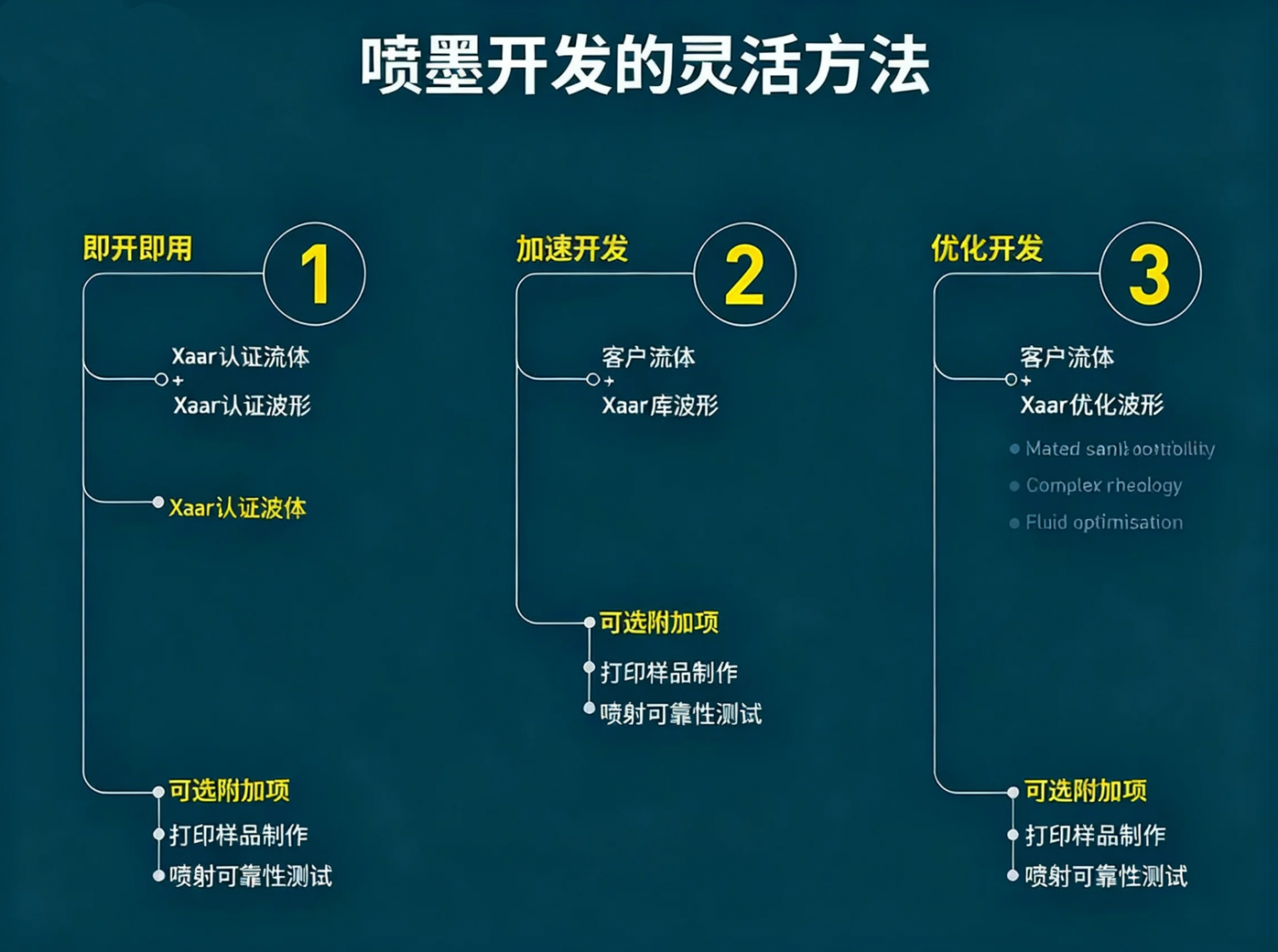 新工藝支持三種關(guān)鍵的開發(fā)路徑。最快捷的途徑是從一系列預(yù)先批準(zhǔn)的流體中進(jìn)行選擇,每種流體都提供定制的波形,并已確認(rèn)與 Xaar 打印頭兼容。這些流體已針對多種應(yīng)用進(jìn)行了優(yōu)化,可實(shí)現(xiàn)快速的系統(tǒng)集成。