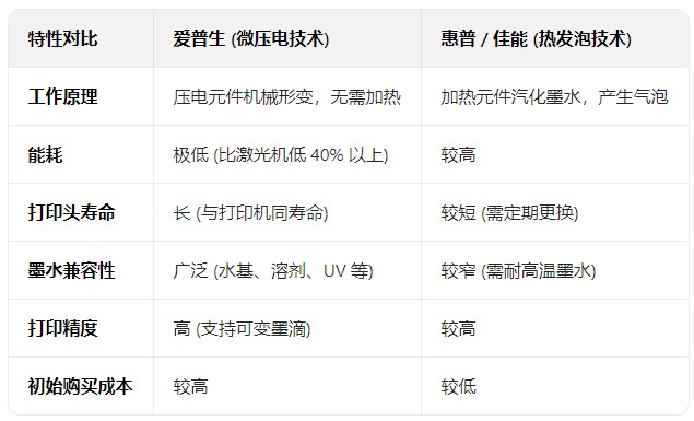 在噴墨打印技術(shù)領(lǐng)域,愛普生與惠普、佳能等主要競爭對手在技術(shù)路線上存在根本性的差異,這直接影響了其產(chǎn)品的性能、成本和應(yīng)用范圍。愛普生堅持采用微壓電技術(shù),而惠普和佳能則主要采用熱發(fā)泡技術(shù)。這兩種技術(shù)在工作原理、能耗、打印質(zhì)量和耐久性等方面各有優(yōu)劣,形成了不同的市場定位和用戶群體。