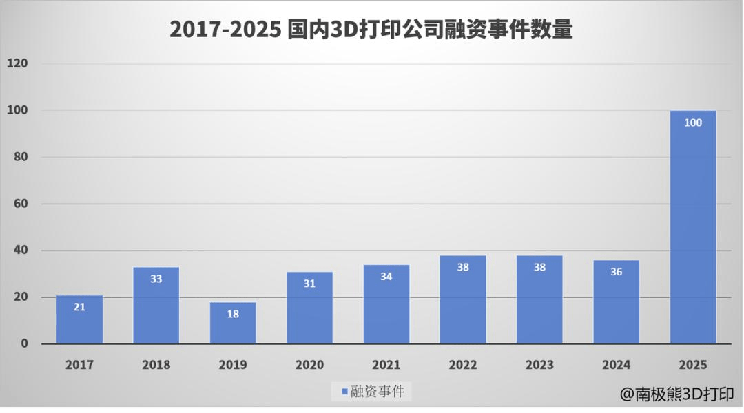 據(jù)南極熊3D打印的數(shù)據(jù),過去幾年,國內(nèi)3D打印行業(yè)投融資事件基本上維持在30-40個之間,而2025年的融資事件直接達到了100個(涉及81家公司,部分公司融資2-3次),翻了快3倍。