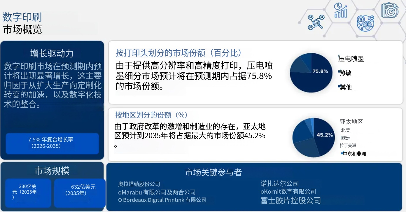 2025年,數(shù)字印刷市場(chǎng)規(guī)模超過330億美元,預(yù)計(jì)到2035年底將達(dá)到632億美元,在預(yù)測(cè)期(即2026-2035年)內(nèi),復(fù)合年增長(zhǎng)率為7.5%。2026年,數(shù)字印刷行業(yè)規(guī)模估計(jì)為354億美元。