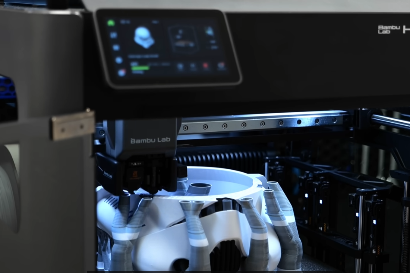 H2C的核心競(jìng)爭(zhēng)力源于其搭載的Vortek熱端更換系統(tǒng),這一系統(tǒng)徹底改變了傳統(tǒng)多材料打印的"洗噴頭"模式,轉(zhuǎn)而采用"換噴頭"的創(chuàng)新思路——正如Bambu Lab在技術(shù)研發(fā)中提出的類比:"與其清洗畫筆,不如直接更換畫筆"。該系統(tǒng)將七個(gè)噴嘴集成于腔室右側(cè)的專用機(jī)架中,依靠磁性附件與感應(yīng)加熱元件實(shí)現(xiàn)高速切換,機(jī)架通過垂直移動(dòng)機(jī)構(gòu)可快速完成刀具更換,讓多材料打印的連續(xù)性大幅提升。