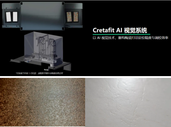 · AI智能對(duì)位加持:融入CretaFit AI視覺(jué)系統(tǒng),進(jìn)料處精準(zhǔn)識(shí)別瓷磚位置與浮雕紋理,實(shí)時(shí)完成圖形平移、旋轉(zhuǎn)調(diào)整,毫米級(jí)定位打印無(wú)需停機(jī),避免疊印與墨水浪費(fèi),大幅提升生產(chǎn)效率。