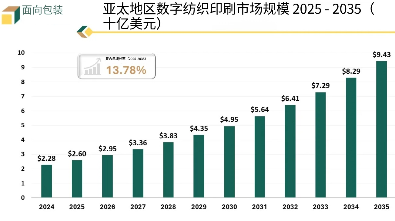概述:2026年全球數(shù)碼紡織印花市場規(guī)模為76.3億美元,預(yù)計(jì)到2035年將增長至224.6億美元,2024年至2035年間的復(fù)合年增長率(CAGR)為12.75%。這一快速增長主要得益于時(shí)尚、家居裝飾和工業(yè)應(yīng)用領(lǐng)域?qū)Χㄖ苹⒖沙掷m(xù)性和創(chuàng)新性的需求不斷增長。本報(bào)告深入分析了市場規(guī)模、生產(chǎn)效率和材料使用情況,并洞察了市場趨勢、區(qū)域偏好和消費(fèi)者需求。報(bào)告還探討了印花工藝(織物直接印花、服裝直接印花)、油墨類型(熱升華、顏料、活性油墨)和材料操作(單次打印、多次打印)。