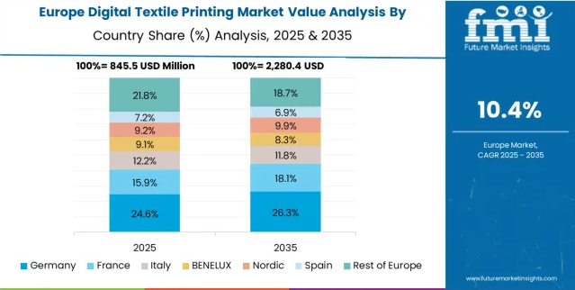 歐洲數(shù)碼紡織印花市場(chǎng)預(yù)計(jì)將從2025年的13億美元增長(zhǎng)到2035年的41億美元,預(yù)測(cè)期內(nèi)復(fù)合年增長(zhǎng)率(CAGR)為12.2%。德國(guó)憑借其強(qiáng)大的產(chǎn)業(yè)基礎(chǔ)和對(duì)高端、技術(shù)先進(jìn)的印花系統(tǒng)的需求,在2025年占據(jù)該地區(qū)28.0%的市場(chǎng)份額,并預(yù)計(jì)到2035年仍將保持這一份額。